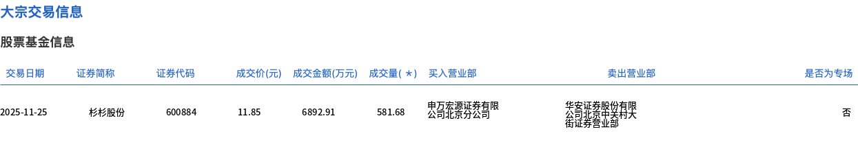 11月25日,杉杉股份大宗交易成交581.68万股,成交额6892.91万元,占当日总成交额的6.4%,成交价11.85元,较市场收盘价12.71元折价6.77%。