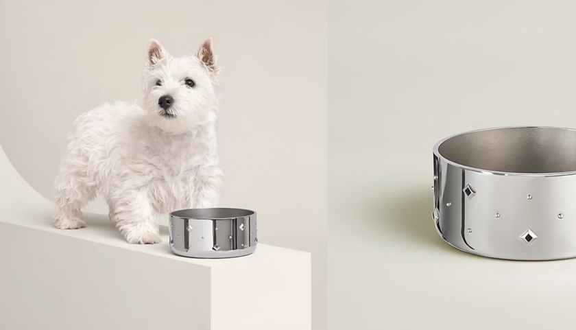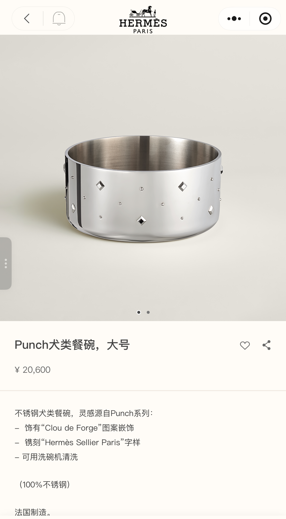 界面新闻注意到,近日奢侈品牌爱马仕在其官网上架两款不同型号的不锈钢犬类餐碗,定价分别为18300元(小号)和20600元(大号)。